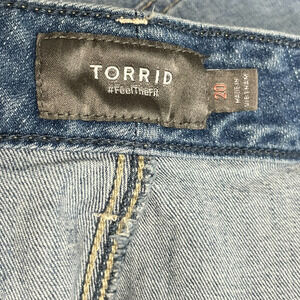 Torrid medium wash denim jean shorts, flat front with back flap pockets, side slant pockets