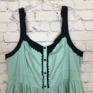 Charming mint green dress with black accents. Features playful design at the hem. Sleeveless with button details.