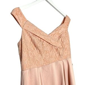 "Channel your inner Aurora in this head-turning satin and lace gown with a beautifully draped hi-lo hemline and an alluring off-the-shoulder neckline that’s fit for a real-life princess."