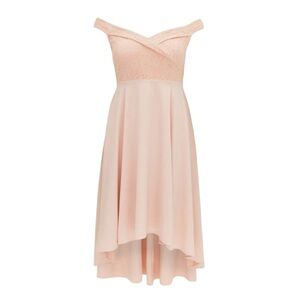 "Channel your inner Aurora in this head-turning satin and lace gown with a beautifully draped hi-lo hemline and an alluring off-the-shoulder neckline that’s fit for a real-life princess."