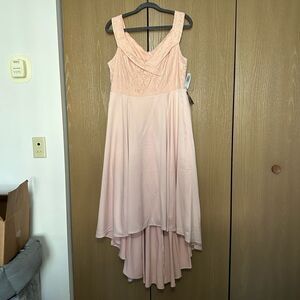 "Channel your inner Aurora in this head-turning satin and lace gown with a beautifully draped hi-lo hemline and an alluring off-the-shoulder neckline that's fit for a real-life princess."