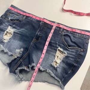 Poshmark’s AI description: These Torrid jean shorts feature a stylish distressed design with significant ripped and frayed detailing. Made from medium-wash blue denim, they offer a trendy, worn-in look with raw hem edges for a casual vibe.