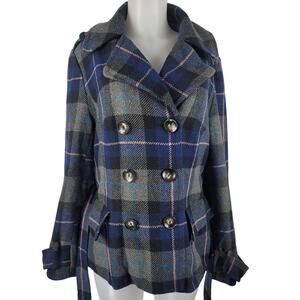 Torrid Vintage Women's Double Breasted Gray/Black/Blue/Pink Plaid Jacket with Belt 1/1X In Amazing Condition. Wool Blend, and Front Pocket. Approximate Measurements (Flat) Length 26" Chest 23" Sleeve 26" Bin Closet