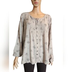 This blouse is lightweight and loose fitting - really comfortable and easy to wear. It's a soft, dove grey color with a black paisley print and there are no stains or holes.