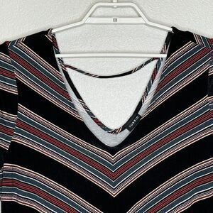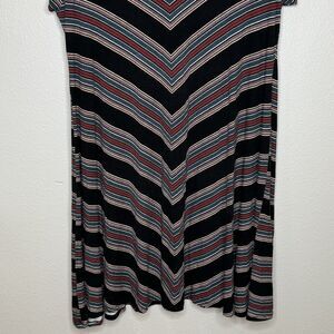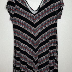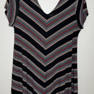 Women's Torrid Swing Dress - Size 2 Short Sleeve Black w/ Multicolor Stripe V-Neck Front & Back Knee Length Rayon/Spandex Casual Swing Dress