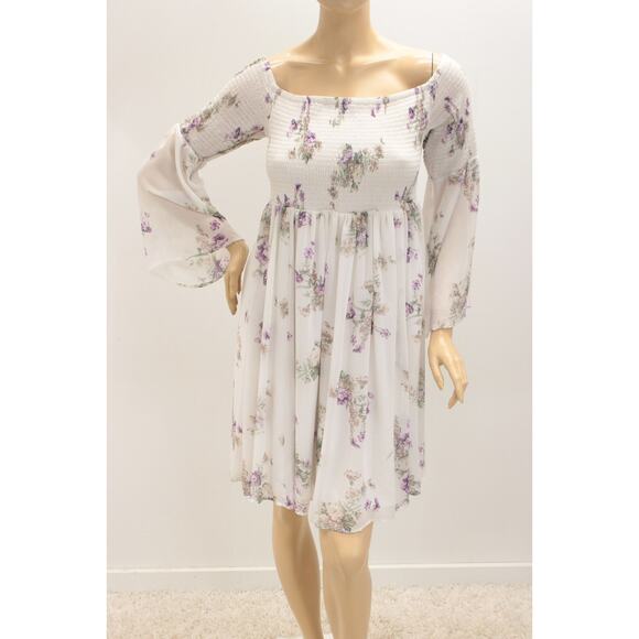 Torrid Dress Women's 1X Midi White Chiffon Smocked Floral Bell Sleeves Lined