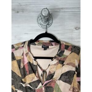 Item: Womens dress with multicolor abstract geometric print and textured clip-dot (dobby) sheer overlay