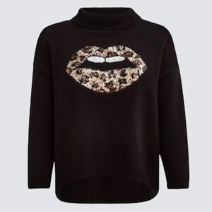 Torrid Drop Shoulder Turtle Neck Sweater Leopard Lips Black, Size 3/4- Cotton blend oversized, mock neck sweater with large leopard sequin lip motif. I only got the opportunity to wear this sweater once, and it’s still in great condition. This is a split size sweater in a boxy oversized silhouette. I used to wear a size 4, and still had tons of room in this sweater.