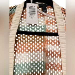 Lightweight and effortless, this Torrid open-front duster vest sweater is perfect for layering. The breathable crochet knit design features a mix of earthy stripes in terracotta, cream, sage green, and tan for a fresh boho vibe. With its sleeveless cut and flowy fit, it’s versatile enough to wear over tanks, tees, or dresses through every season.