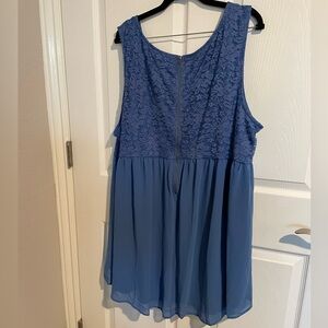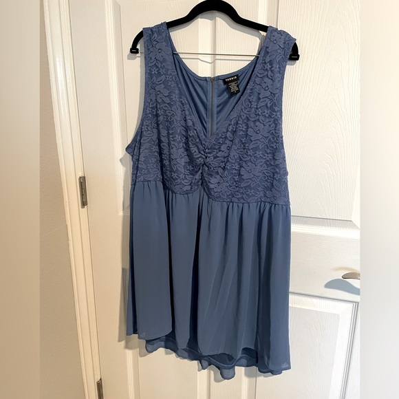 Torrid size 4. Dusty blue top with lace overlay and back zipper. Rusched at cleavage. Much more flattering on than in the photos. Excellent condition. Smoke free home.