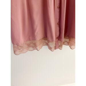Plus size mauve blouse by Torrid feature cold shoulder, adjustable spaghetti straps, front pleats, lace hem, button front, and flowy silhouette.