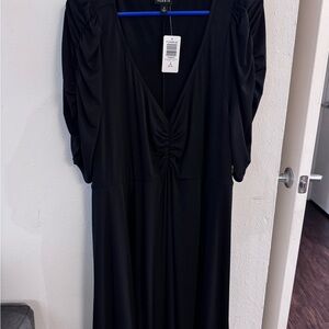 Chic black dress with stylish ruched sleeves. Perfect for versatile occasions.