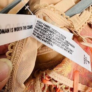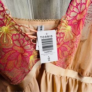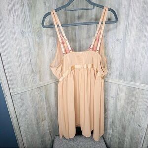 Beautiful Chemise Baby Doll Slip Dress with Nude Sheer Embroidered Cups. Adjustable Straps. Approx measurements pit to pit 24”, Length from top of bodice to bottom 31”.