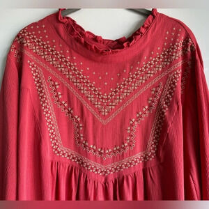 Torrid Embroidered Blouse Size 5 Crinkle Gauze Coral Long Sleeve Boho Prairie