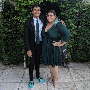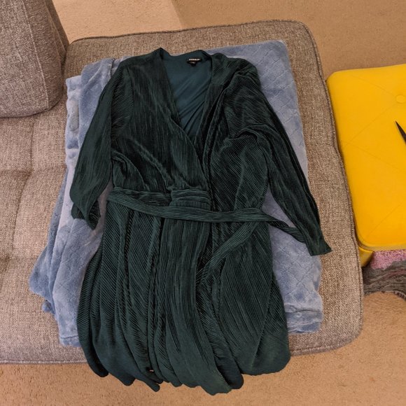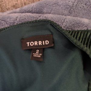 Torrid Size 2. I LOVE THIS DRESS SO MUCH AND AM SAD TO SEE IT GO (I don't fit in it anymore). It is so classy, so I've worn it at a wedding and a grand opening event for my job, but it's so comfortable! Can definitely be revealing in the bosom area, I just used a safety pin to bring the cleavage line up a little. 3/4 sleeves.
