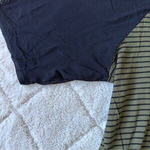 Details: Mesh sleeves, olive with black stripes allover tee. Rounded hem, soft material. Cozy shirt for lounging in!