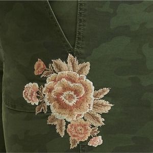 Detailed floral embroidery stands out against a camo background of twill cutoff shorts.