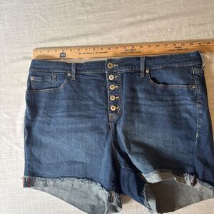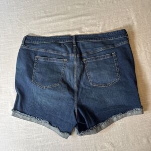Torrid Feel The Fit Button Fly Cuffed Frayed Look Stretchy Denim Shorts Size 22 - small mark on front shown in last photo