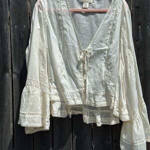 Elegant blouse with lace accents. Features a tie-front and flowing sleeves. Perfect for a chic look.