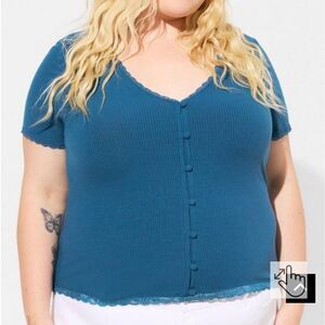 Torrid Fitted Supersoft Rib V-Neck Lace Trim Button Crop Tee