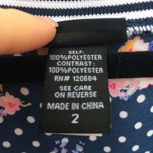 Navy blue base, White polka dots, vibrant Pink/Orange rose floral pattern