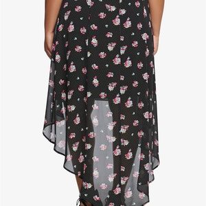 Chic and stylish, this black high-low skirt features a beautiful floral pattern. Perfect for any occasion.