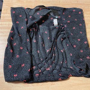 The black and grey georgette lightens up with a coral floral pattern. The strappy neck will cause heads to turn. Slight puckering lends a touch of swing.
