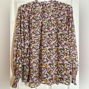 Chic floral blouse by Torrid. Features a brown base with pink and white flowers. Long sleeves with elastic cuffs. Perfect for casual outings.