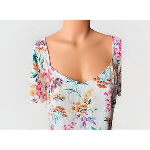 PTP 22. The Torrid Floral Blouse in size 2X is a colorful and lightweight top made from rayon fabric. It features a V-neckline, short flutter sleeves, and a pullover closure for easy wear. The blouse is designed in a regular fit and is ideal for plus size women looking for a basic yet stylish addition to their wardrobe. The floral pattern adds a touch of femininity, making it a versatile option for various occasions.