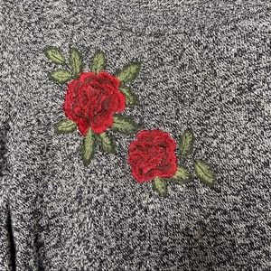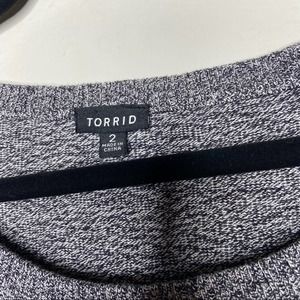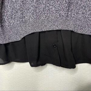 Torrid faux layered sweater, size 2. Grey and black marled cotton knit sweater with floral embroidery. Features a black chiffon shirttail hem to create a faux layered look. In like new condition, without flaws. Torrid size 2 is equivalent to a 2X or 18/20.