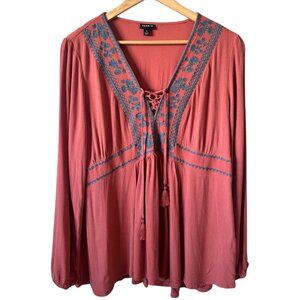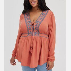 TORRID Tunic Sz 1X Rust Floral Embroidered Boho Long Sleeve Blouse Babydoll
