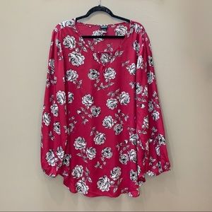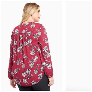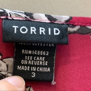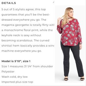 Torrid 10693423 FLORAL PRINT GEORGETTE KEYHOLE TOP, plus sz 3, 3X. “The magenta georgette is totally flirty with a monochrome floral print, while the keyhole neck is sexy without becoming scandalous. The curved shirttail hem basically provides a wind machine everywhere you go.” Bust 28.5” across, length 26 inches. Pre loved good condition.