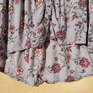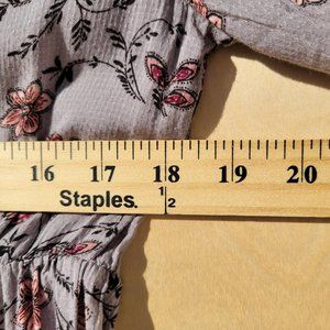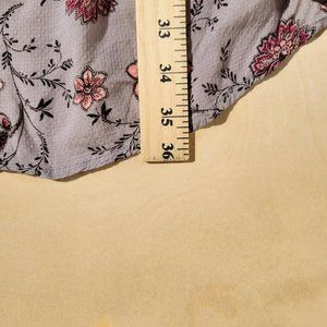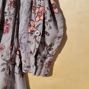 Elegant gray blouse with pink floral pattern. Features lace sleeves. Perfect for casual or dressy occasions.