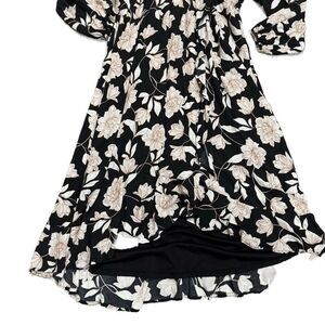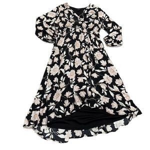 This elegant maxi dress features a stunning black base with delicate floral prints, perfect for both casual outings and special occasions. Designed by Torrid, it comes with long sleeves and a flattering V-neckline. The fabric flows gracefully, adding comfort and style to your wardrobe.
