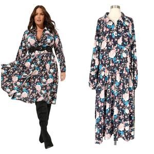 Torrid | Floral Print Crepe Plus Size Blue Pink Pocket Button Midi Dress 4 4 X