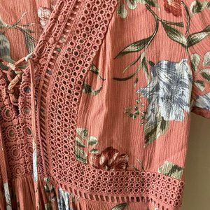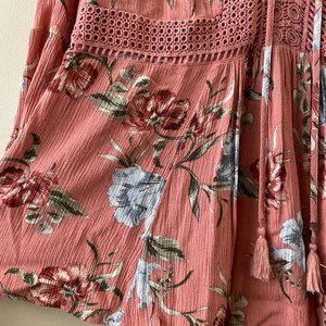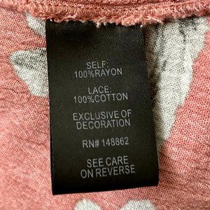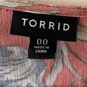 Torrid 00 is equivalent to a size 10. This top is the best combination of lightweight, textured, breathable fabric, while still being totally opaque. It is a beautiful dusty rose color, with blush, light blue, and sage green floral design. This lace-up babydoll top has an adorable tassel tie, empire waistline, and bell sleeves. This top looks great layered with a lace cami or cropped tank for more coverage.