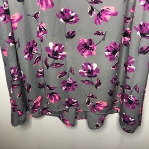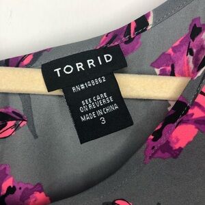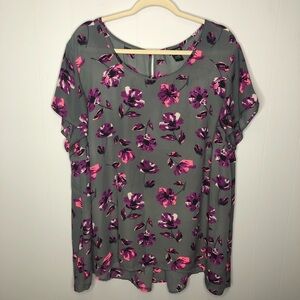 Torrid gray short sleeve blouse with pink, purple, white and black floral print.