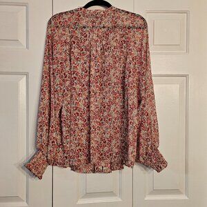 Torrid red, floral, sheer shirt. It is see through. Never worn. The sleeves are "cuffed" a bit.