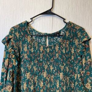 Embrace romantic boho vibes with this Torrid smocked peplum blouse in a beautiful forest green floral print. This plus-size top features long sleeves with ruffled shoulder detailing, a flattering smocked bodice, and a flowy peplum hem — perfect for both casual wear and dressed-up looks.