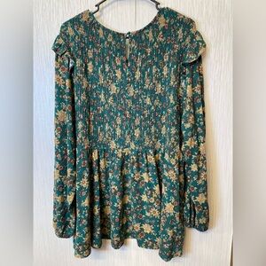 Embrace romantic boho vibes with this Torrid smocked peplum blouse in a beautiful forest green floral print. This plus-size top features long sleeves with ruffled shoulder detailing, a flattering smocked bodice, and a flowy peplum hem — perfect for both casual wear and dressed-up looks.