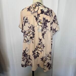 This Torrid floral tunic top in size 1 (US 14/16) offers a chic and flattering style, perfect for casual wear, work outfits, or weekend looks. Featuring a light pink base with purple and cream floral print, it has a relaxed fit, short sleeves, and a deep v-neckline for effortless style. Made from 100% polyester, this tunic is soft, lightweight, and easy to care for. Pair it with jeans, leggings, or layer under a denim jacket for a versatile year-round outfit.