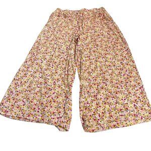 Chic wide leg pants with a floral pattern. Features pink and yellow hues. Comfortable and stylish for any occasion.