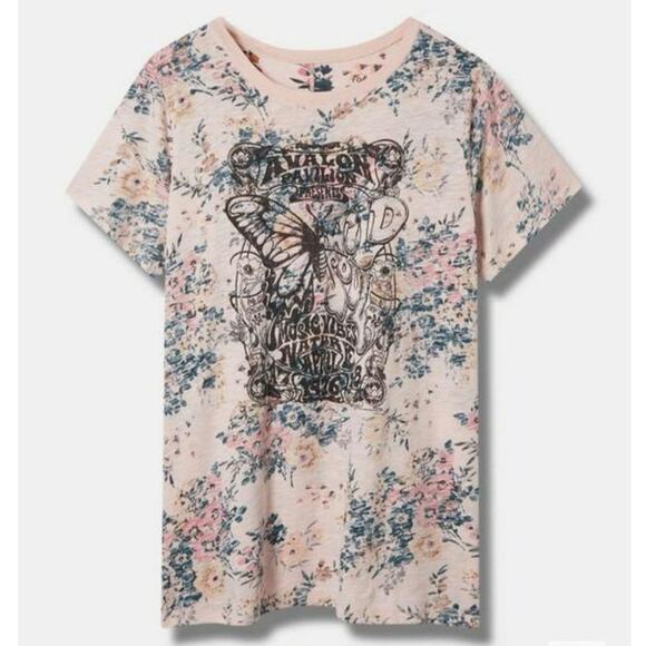 Torrid Floral Wild Soul Vintage Cotton Crew Neck Short Sleeve Tee. Graphic of butterfly and floral, "Avalon Pavilion Presents Music Vibes Nature April 1976"