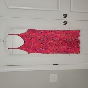 Lovely floral printed sleeveless A-line sun dress. Adjustable spaghetti straps. Scoop neckline. Elastic cinched waist. Lightweight. Features light subtle pleats below the waist. Side pockets. Fully lined.