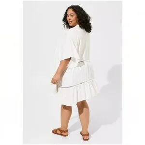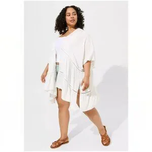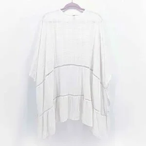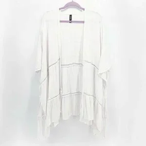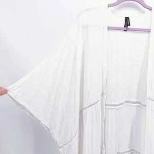 Lightweight white kimono style open cardigan that can be worn casually or at the beach or pool as a cover up! 100% polyester. Side slits. One size