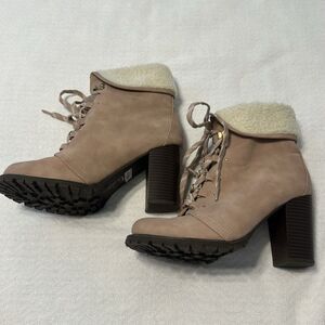 Torrid Foldover Lace Up Shearling Combat Bootie Block Heels Womens 8 W Tan New