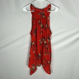 Coral Sleeveless top with floral pattern. Shark bite hem. Double button closure on back of neck. Unlined. 100% polyester. Size 1. Non smoking home.