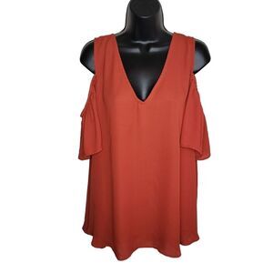 Excellent pre-owned condition. No flaws to note. Women's Torrid Georgette Flutter Sleeve Cold Shoulder Blouse 2/2x.