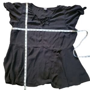 This is a super cute top from Torrid. Black, with a slight peplum waist, features flutter sleeves and an adjustable tie lace neck. In excellent condition!