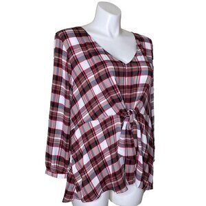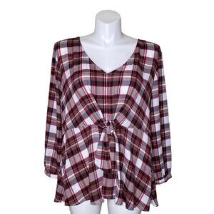 Torrid Georgette Tie-Front Blouse, Red Plaid Long Sleeve V-Neck Women's Size 3